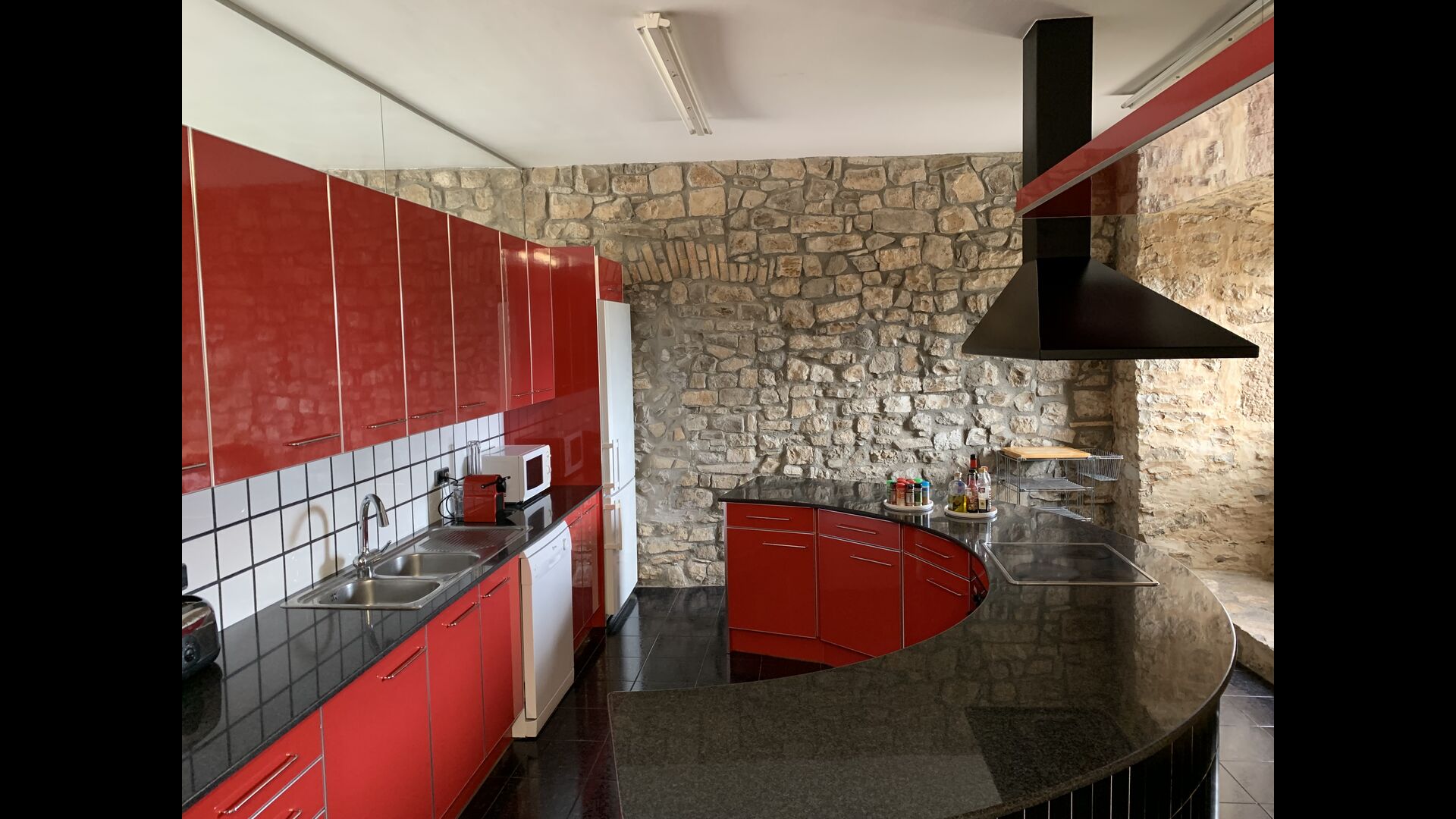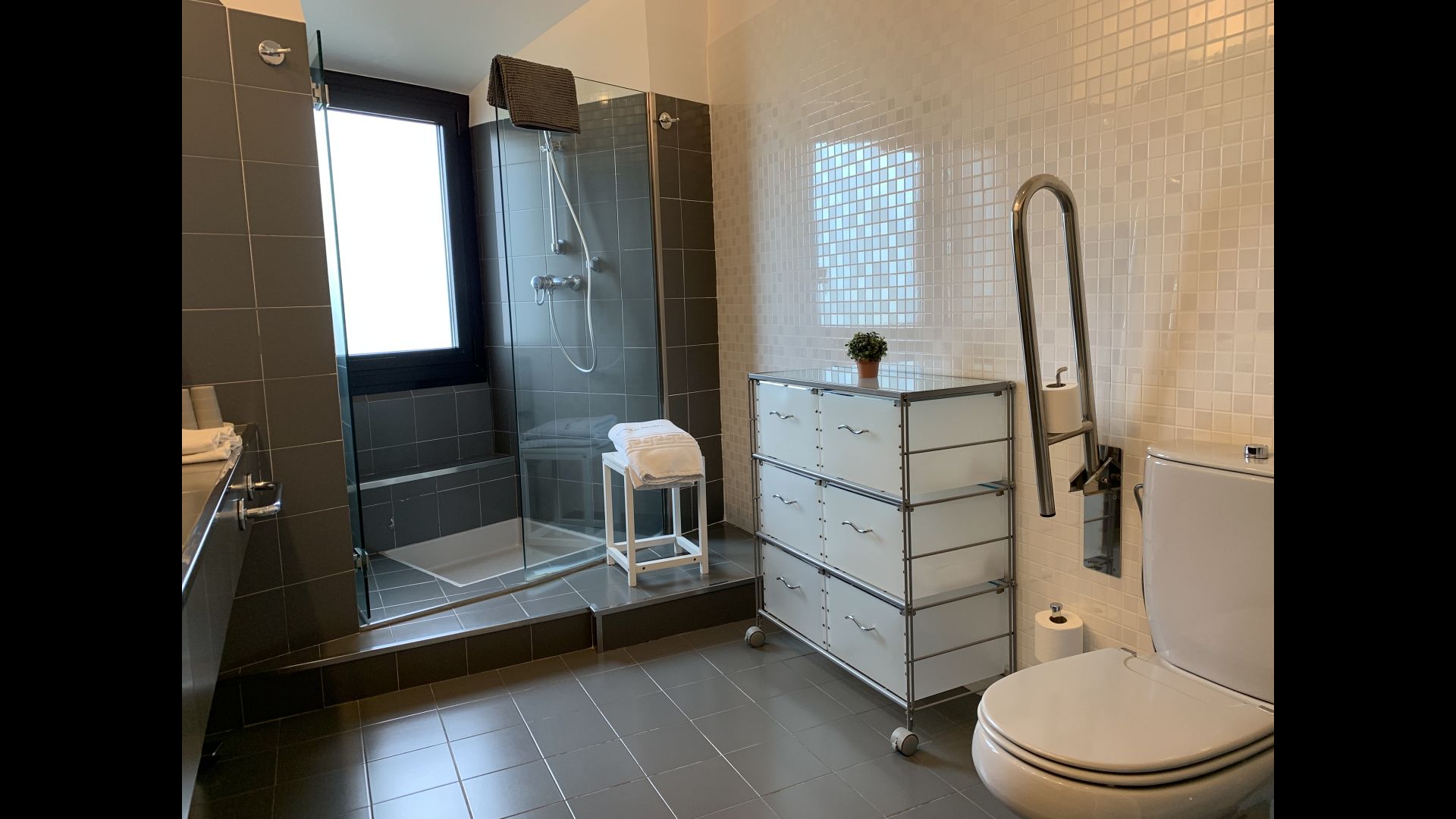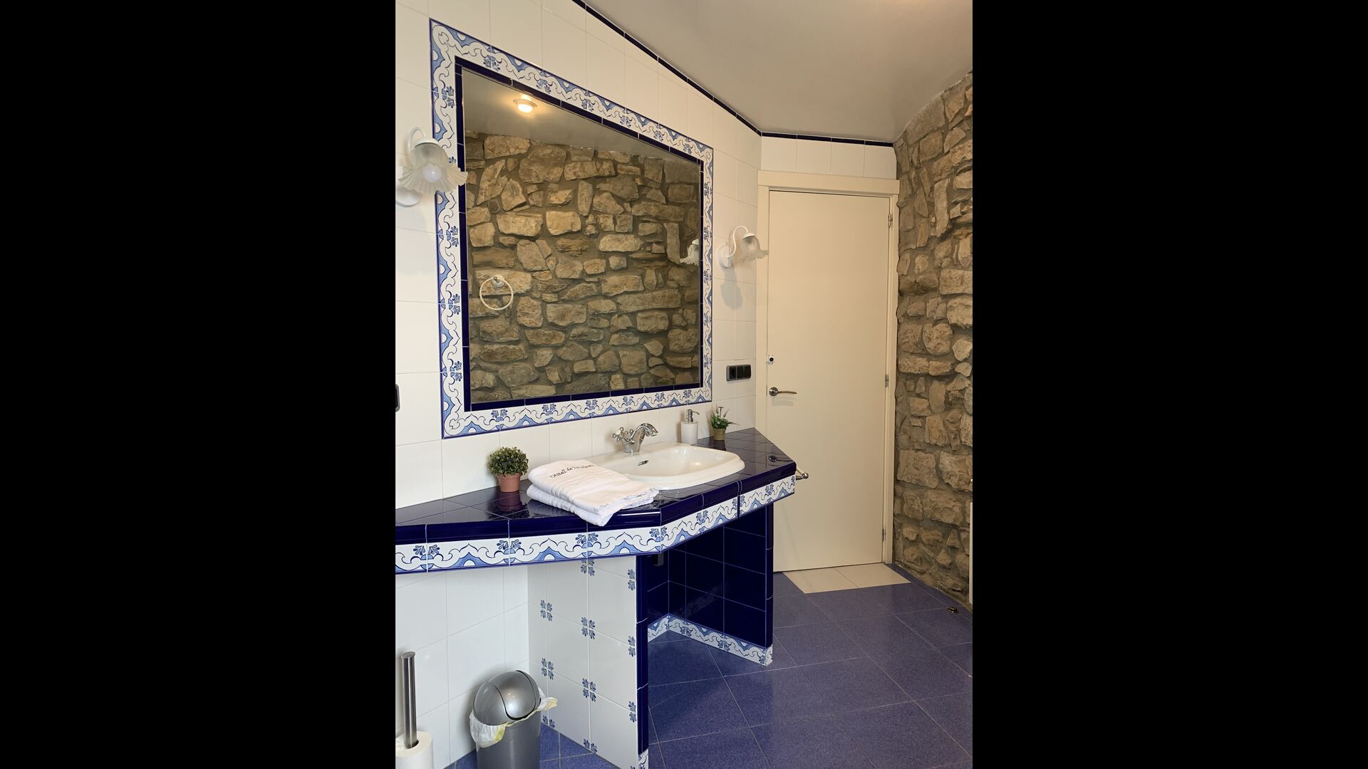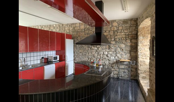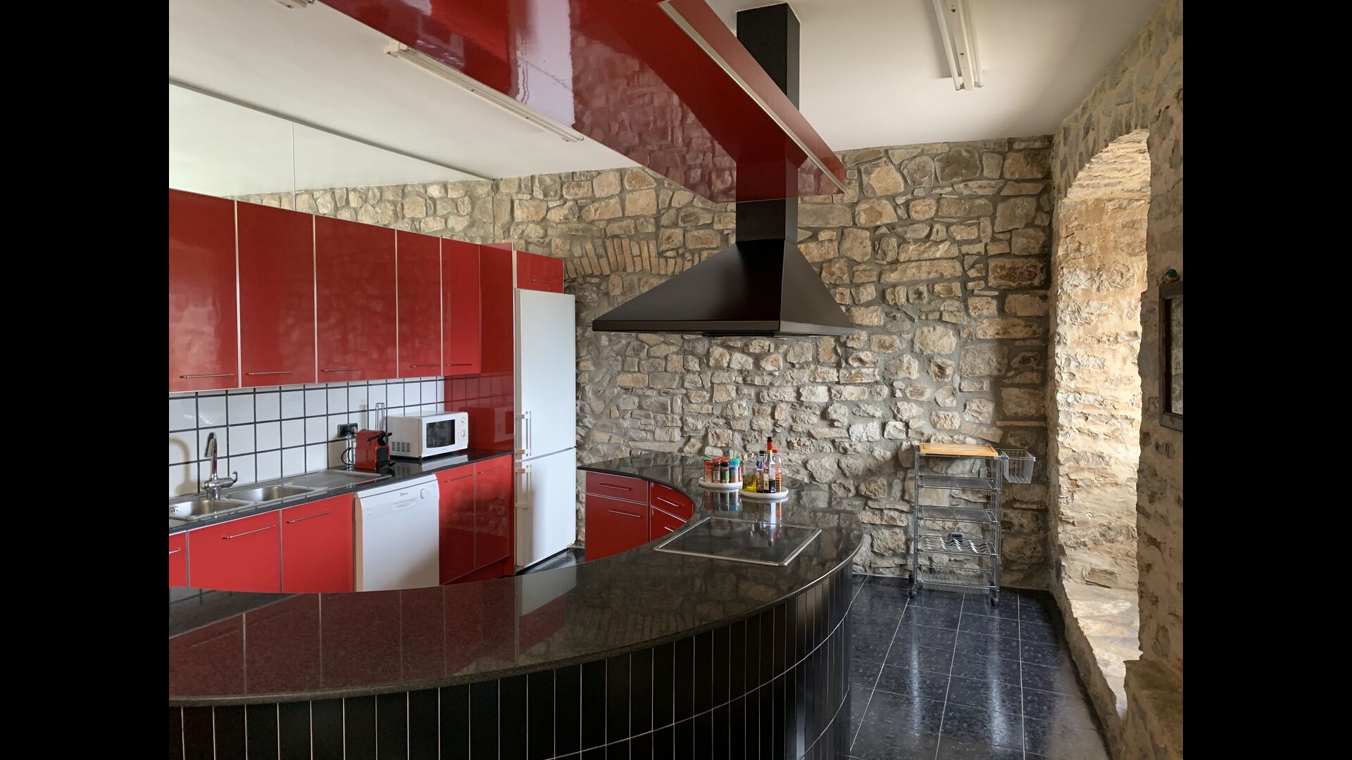 On the first floor, there is a spacious and prettily designed kitchen. It is fully equipped, so you can easily prepare meals at home. Furthermore, there is a lift up to the first floor, which is convenient when you have shopped groceries or when you arrive with suitcases. In addition, you can also buy wine and cava from the wine fields in the area.