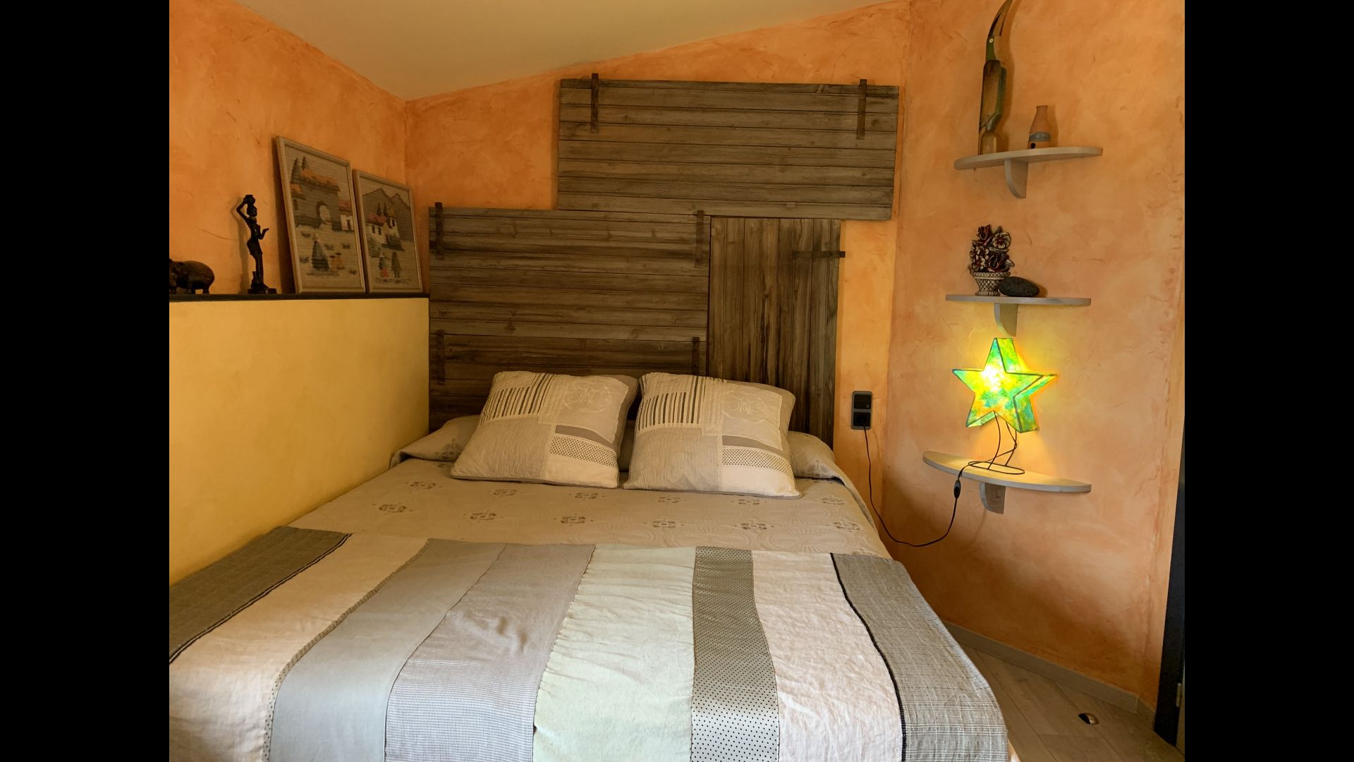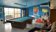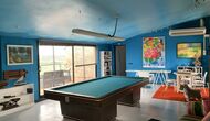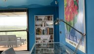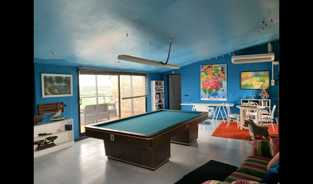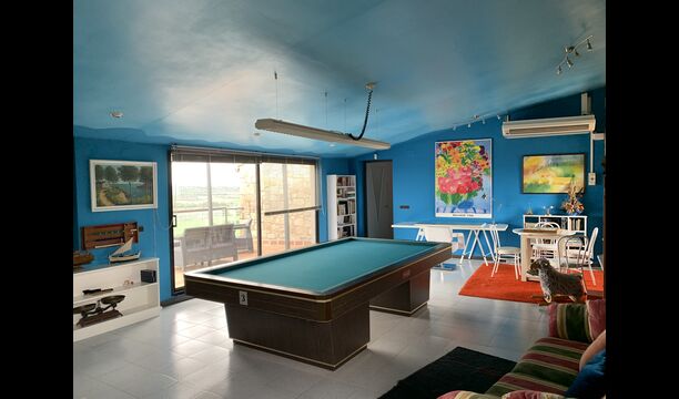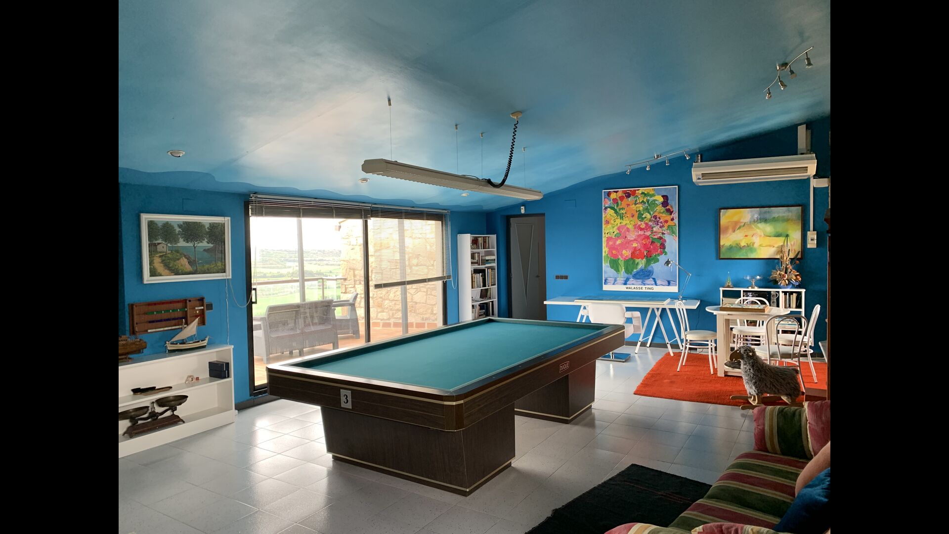 The living room has a stairway up to the second floor where there is a games room with large pool table and play activities for younger children. From here, there is also access to a terrace with seating and sunbeds. Here there is a splendid view over the area.