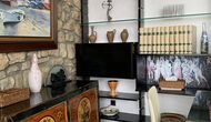 On the same floor, there is the living room, which consists of a sitting area with a large flat-screen TV, a huge dining table, several other seating areas and a fireplace.