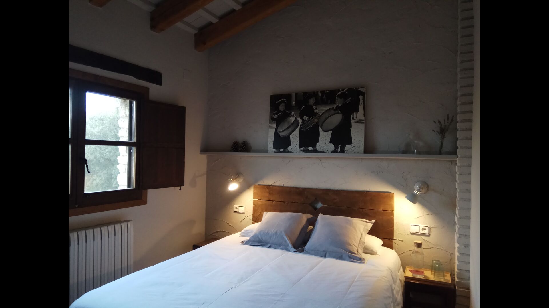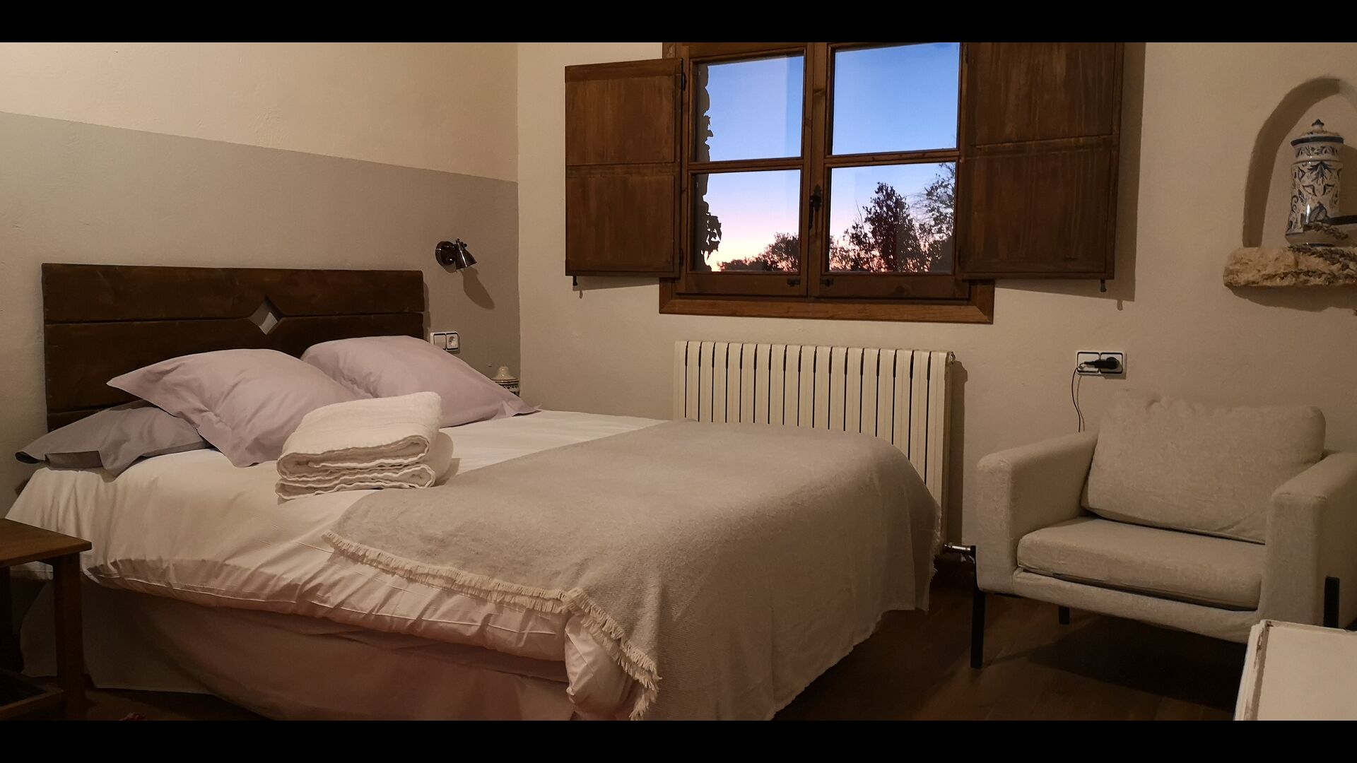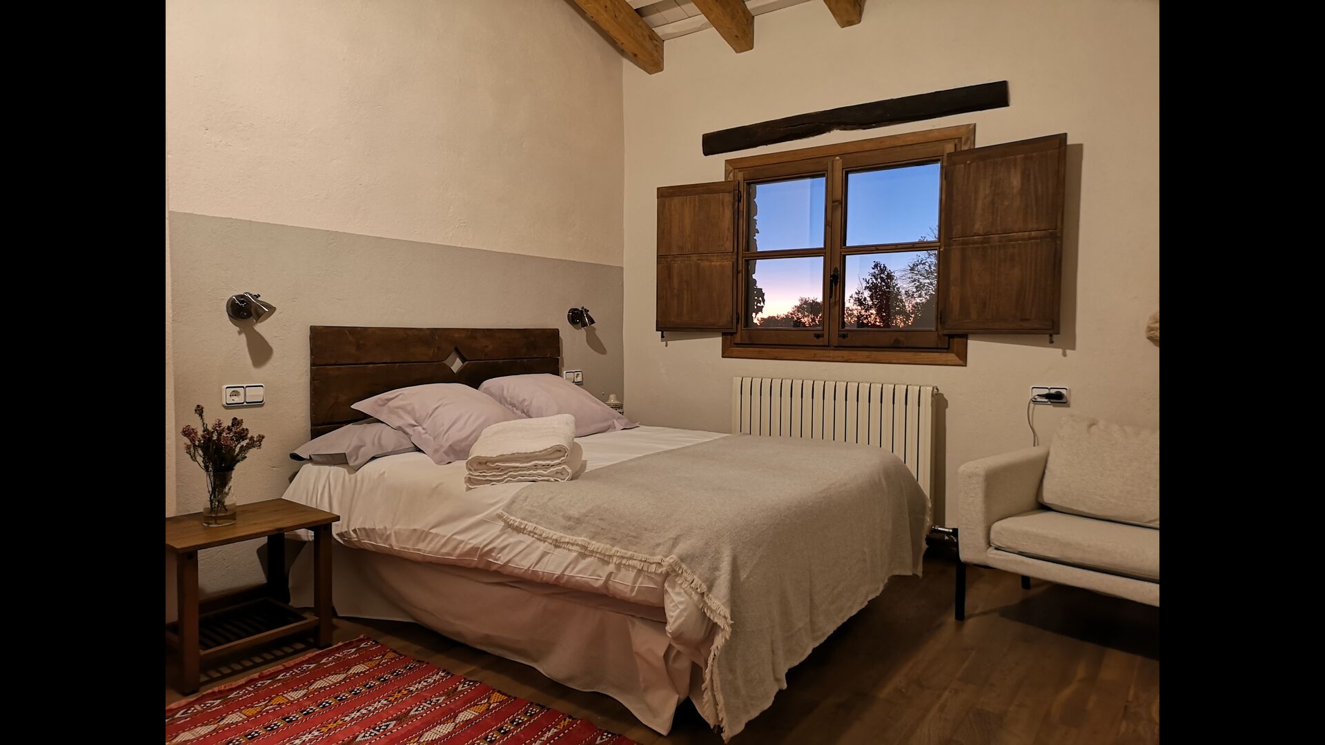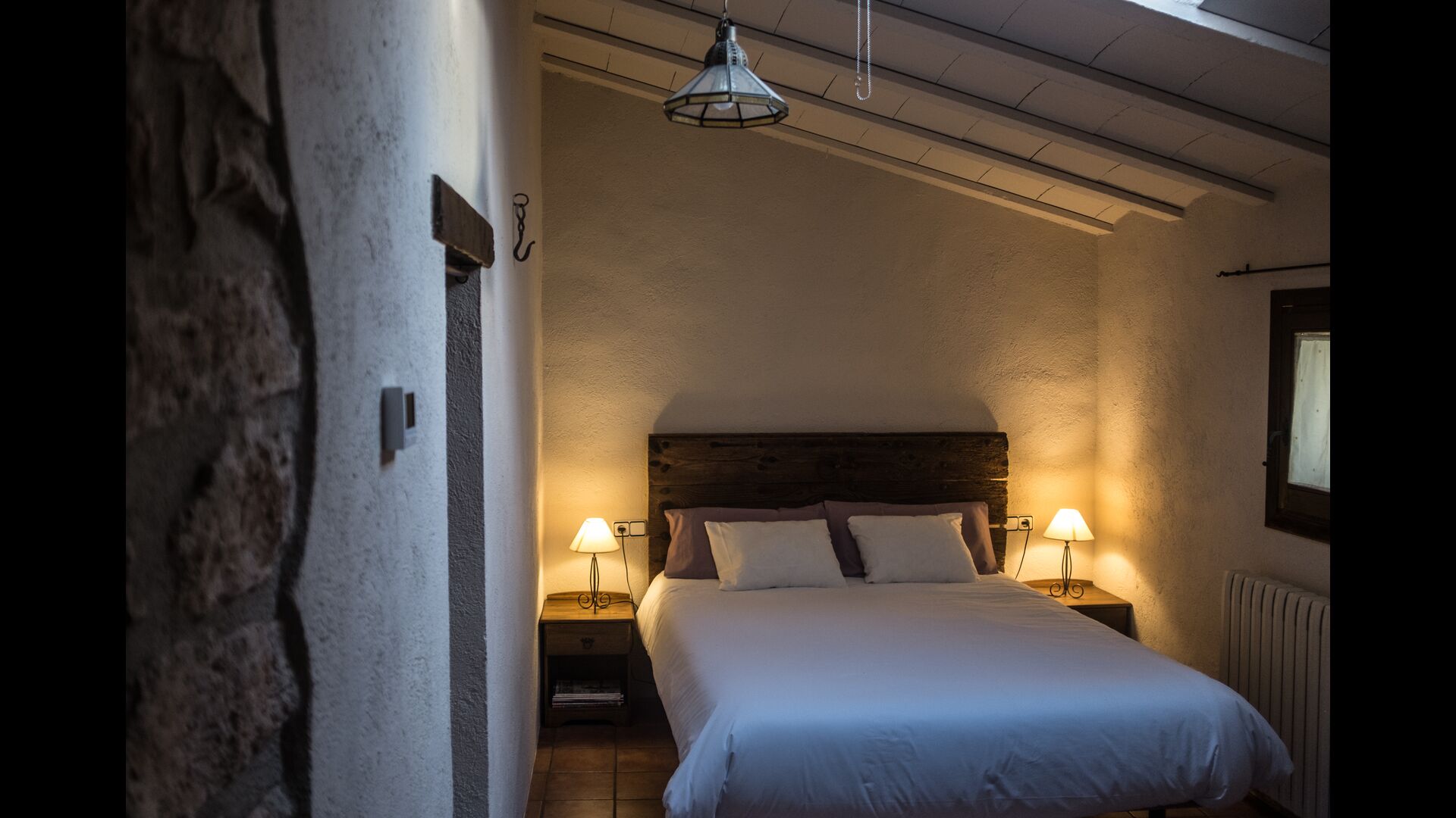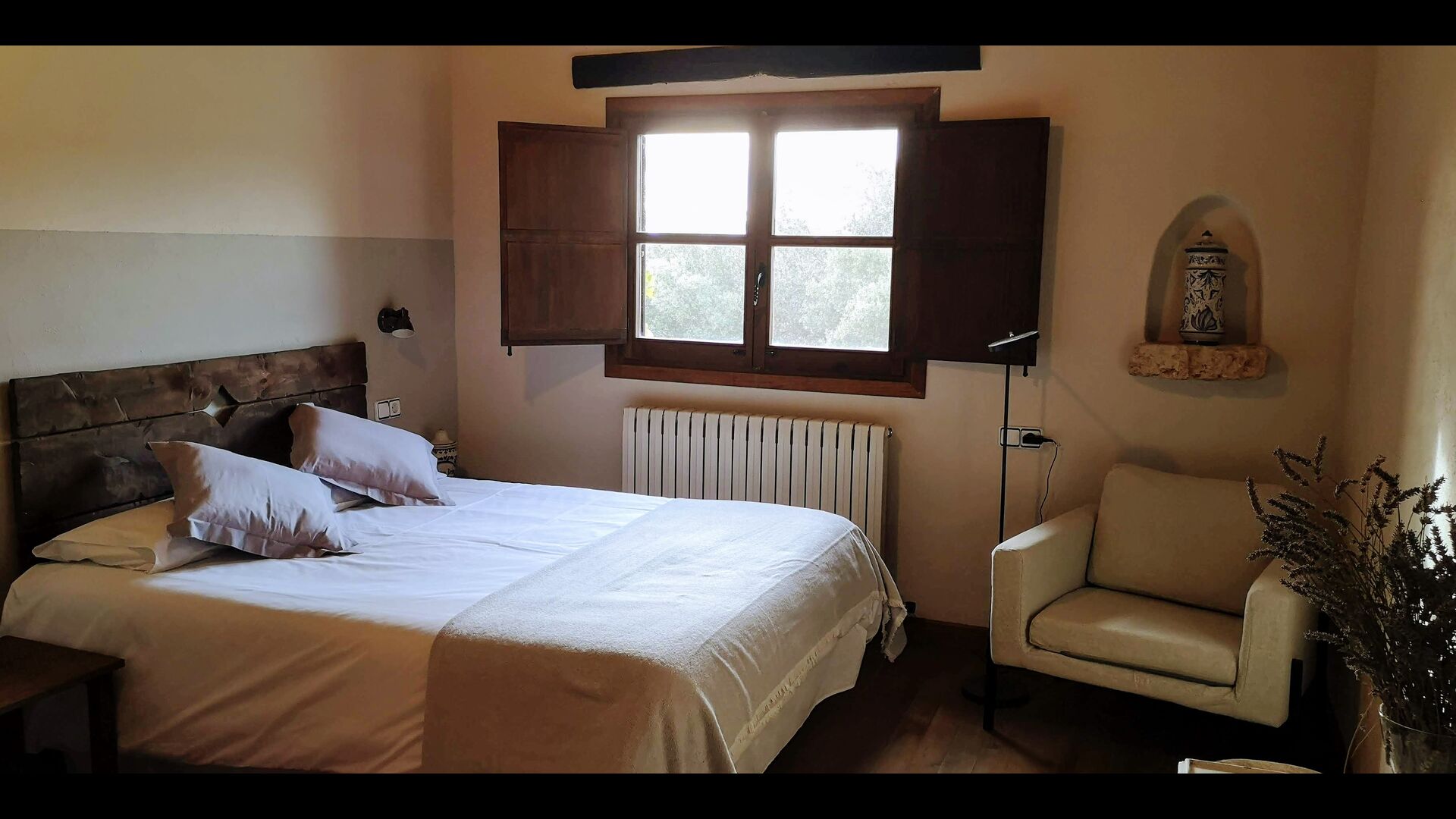 - Mont-Ral: A room with 1 double bed and an ensuite bathroom, coming with a classical, small Catalan wooden table, and views of the garden and the mountains. The bed’s dimensions are 150x190cm.