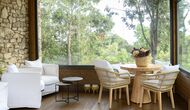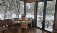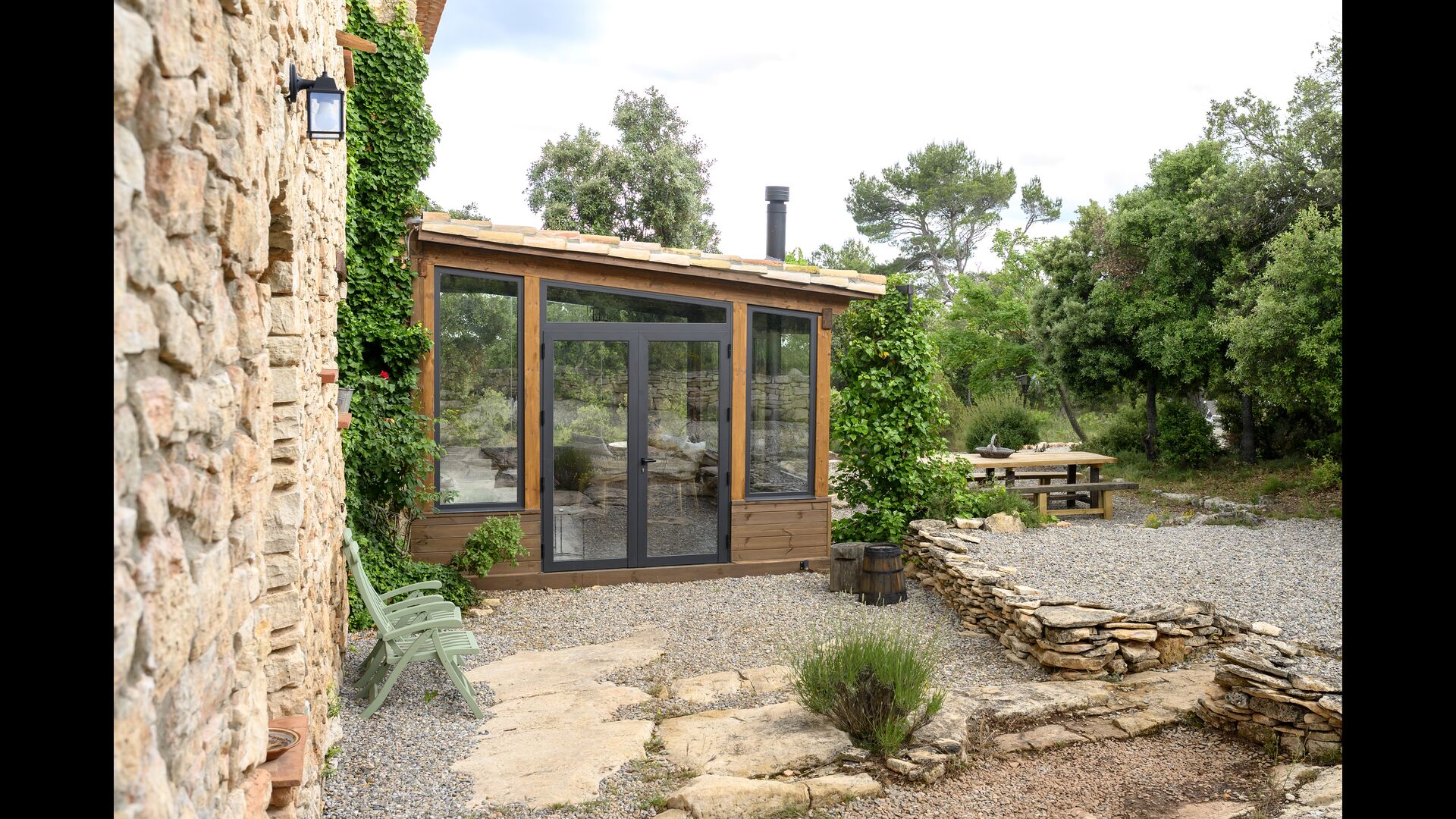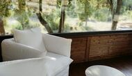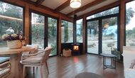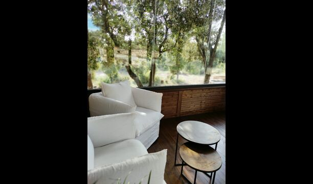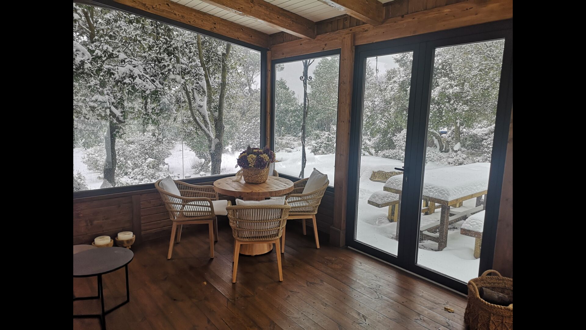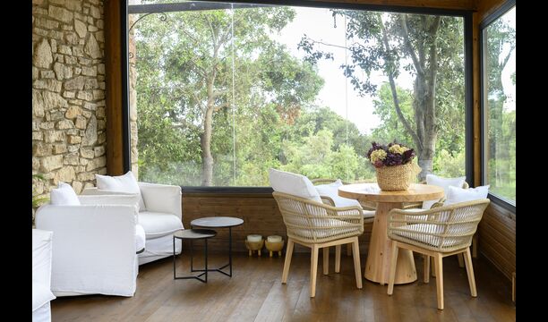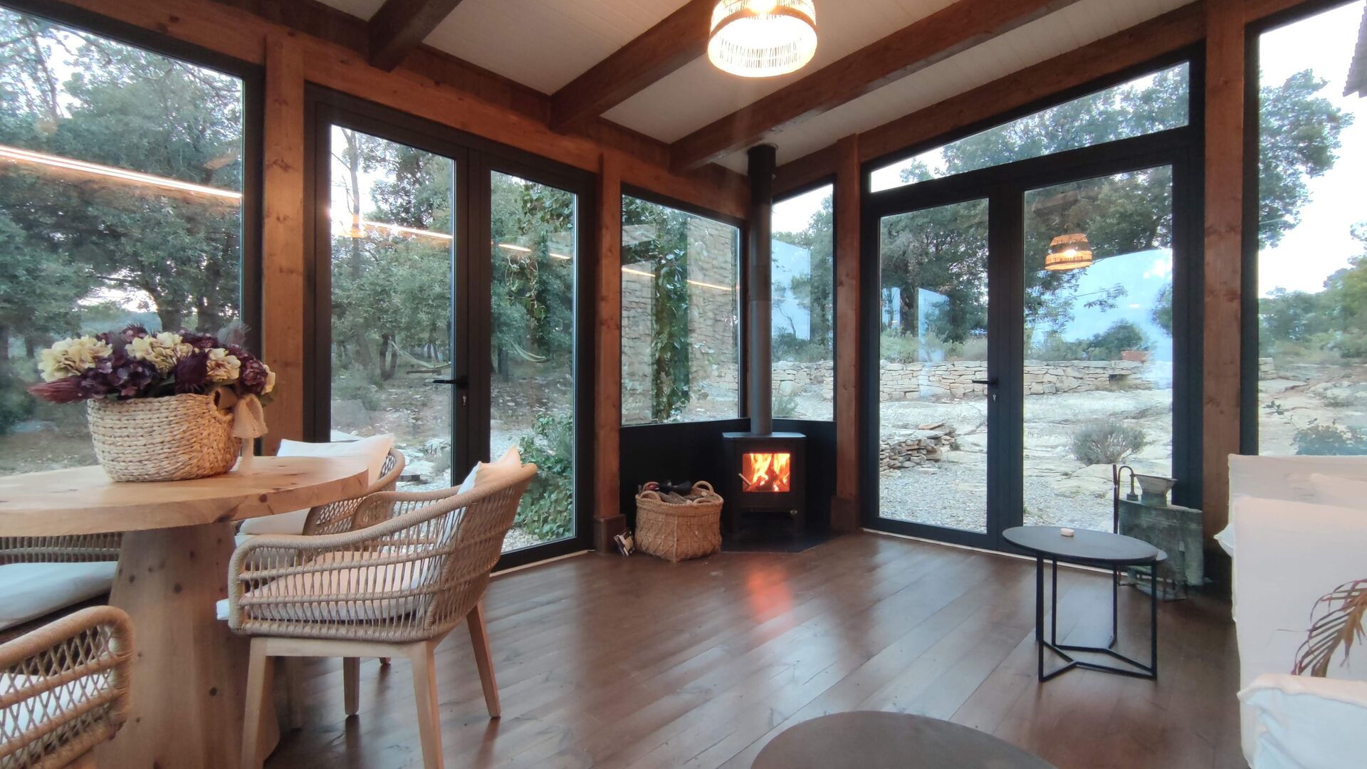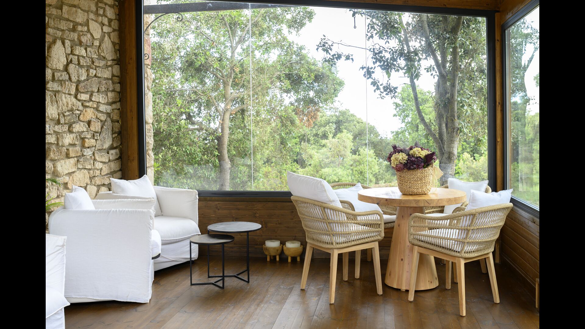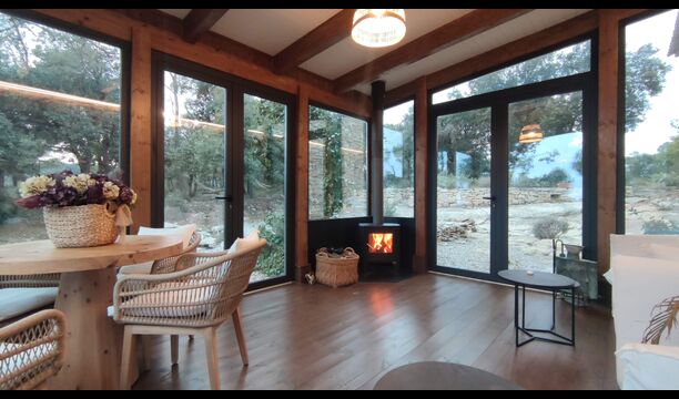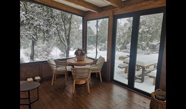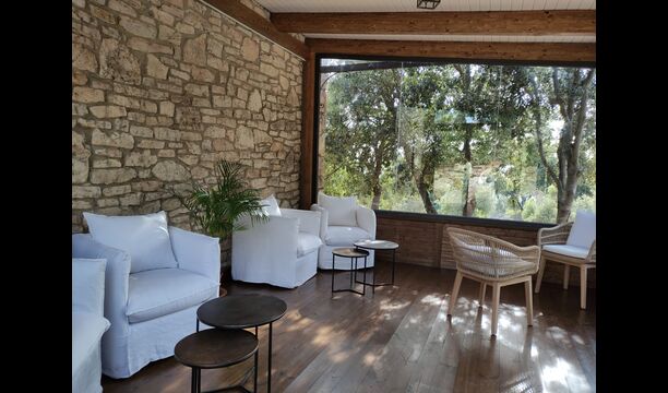Moreover, the house also has a roofed, fully covered terrace area, with large glass windows. This area also has a small stove, sofa chairs and tables to relax at, read books, or play cards. No matter the season or weather, lounging in this area is bound to give you a sense of peace and tranquillity, as you can look out at the great garden – and the marvellous sights of the landscape beyond it.