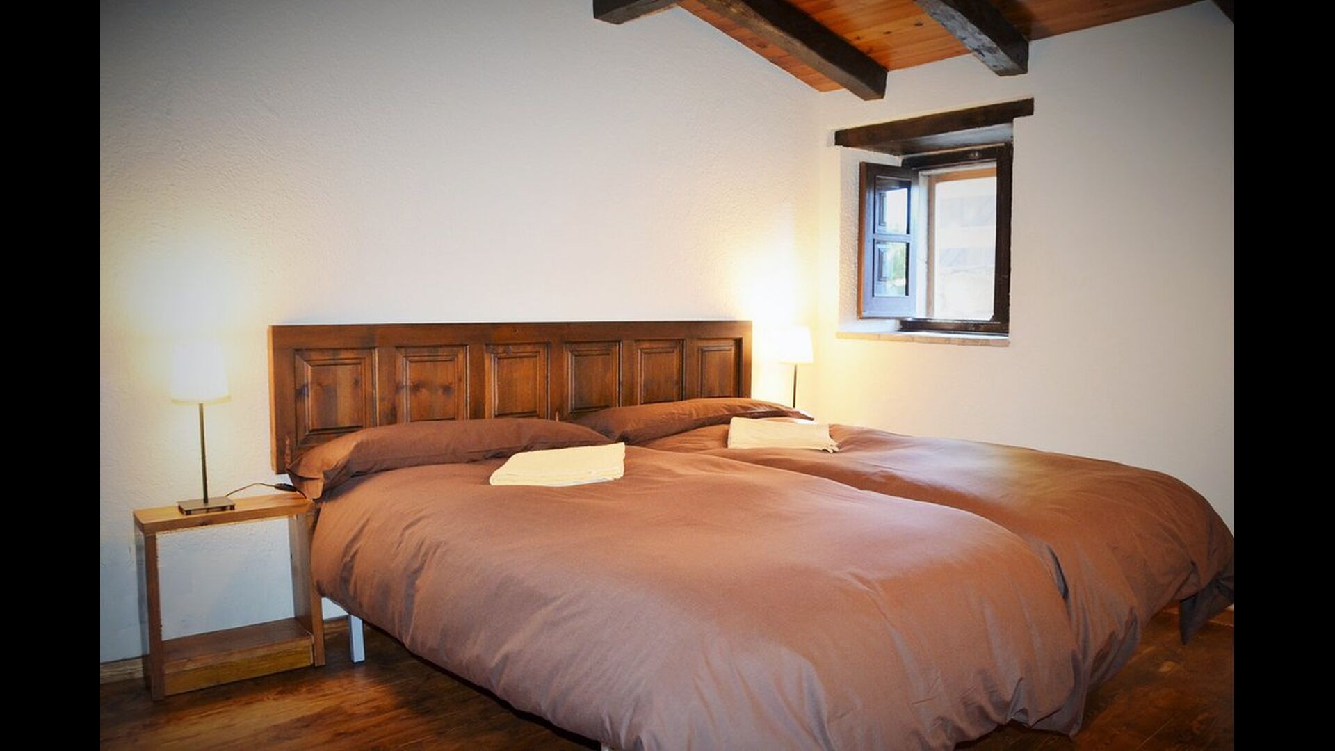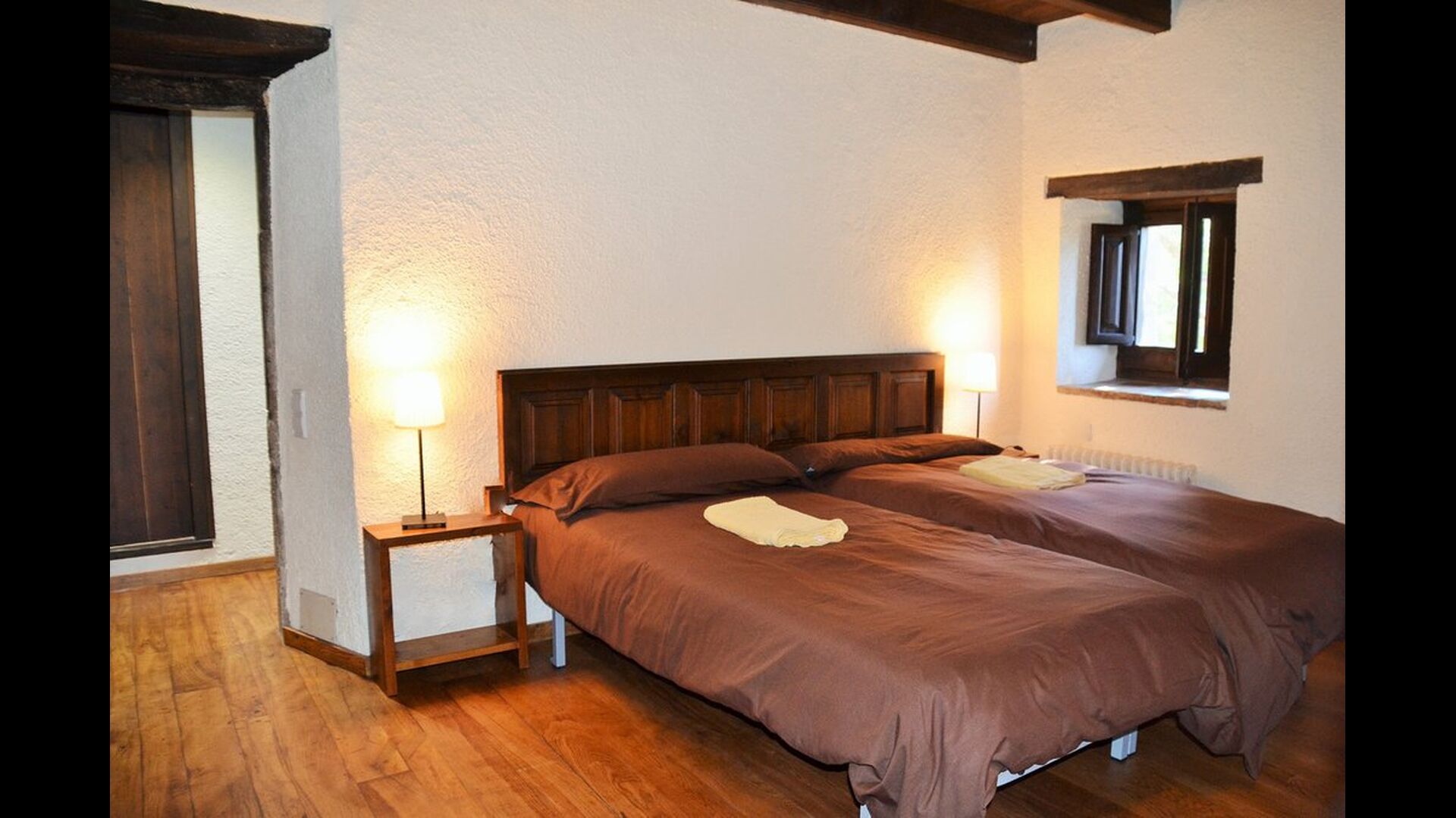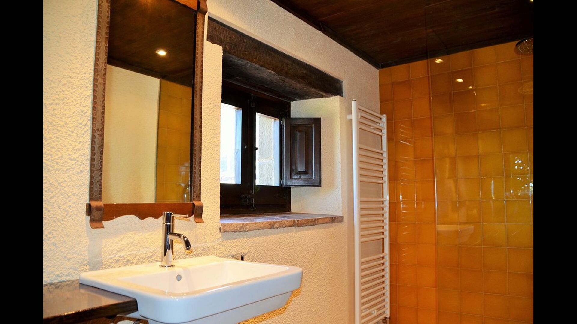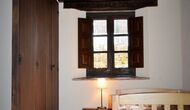 In the first floor, to the left, there is a very nice double bedroom, with some very beautiful details and garden view. Also, a small toilet has been installed. Then, there is the biggest bedroom, with a double bed and two balconies with view to the pool area and the mountains. The desk where many books have been formed is still there as a nice reminder of the history of the house. If necessary, here some extra beds (against supplement) will easily fit, if your group is bigger than 11. This bedroom has a bathroom ensuite. Finally, there is the third, spacious double room with bathroom ensuite.